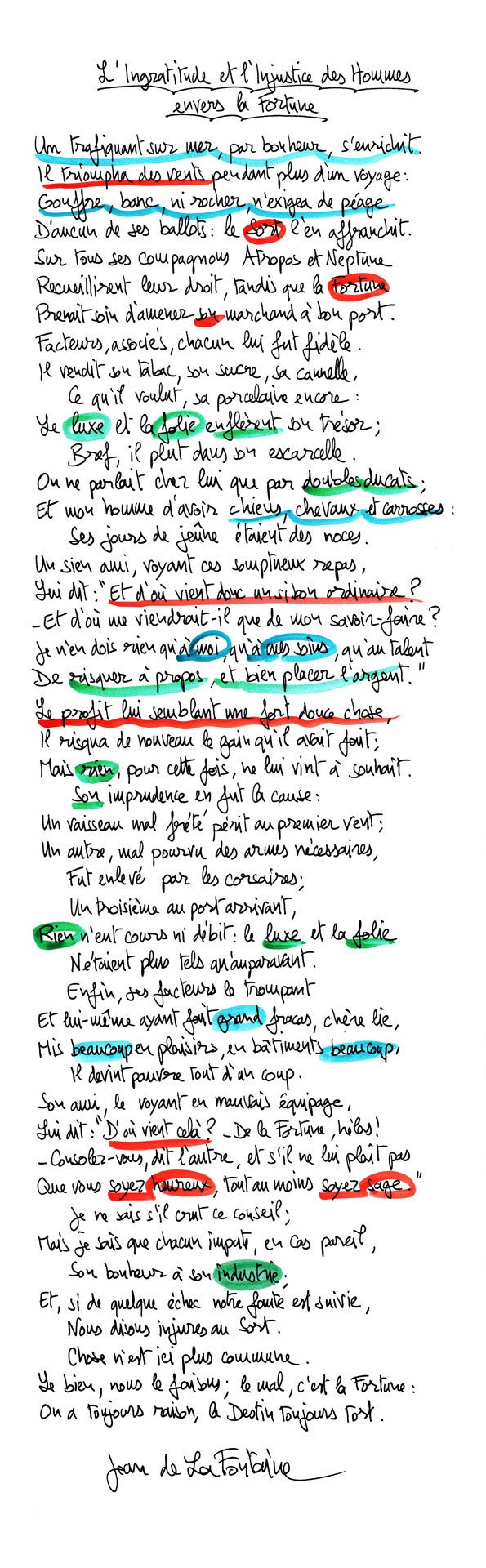 Un Avare à qui l’on dit que le commerce était le moyen le plus prompt de s’enrichir, vendit son patrimoine, et s’embarqua. La Fortune lui fut favorable. En peu de temps, il fit un gain immense. Quelqu’un lui témoignait son étonnement d’une fortune aussi rapide. «Mon industrie, dit-il, m’a tout procuré.» Ses premiers succès le portèrent à de nouvelles entreprises, et deux ou trois naufrages le réduisirent à la plus grande pauvreté. Il accusa la Fortune de ses revers. Elle vit l’ingratitude de l’Avare, qui s’attribuait ses succès à lui-même, et à elle seule ses malheurs.